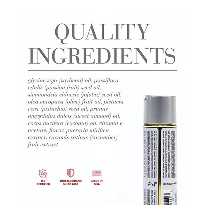 La mezcla única de ingredientes del aceite para masajes JO Aromatix puede transformar cualquier momento íntimo en una experiencia cautivadoramente sensual. Con una combinación de aceites nutritivos para la piel y una fragancia seductora, Aromatix realza cada toque con un deslizamiento rico e hidratante que siempre es placentero, pero nunca grasoso. Todas las fórmulas de Aromatix son besables, mejoran la elasticidad y son aptas para veganos.