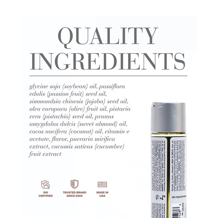 La mezcla única de ingredientes del aceite para masajes JO Aromatix puede transformar cualquier momento íntimo en una experiencia cautivadoramente sensual. Con una combinación de aceites nutritivos para la piel y una fragancia seductora, Aromatix realza cada toque con un deslizamiento rico e hidratante que siempre es placentero, pero nunca grasoso. Todas las fórmulas de Aromatix son besables, mejoran la elasticidad y son aptas para veganos.